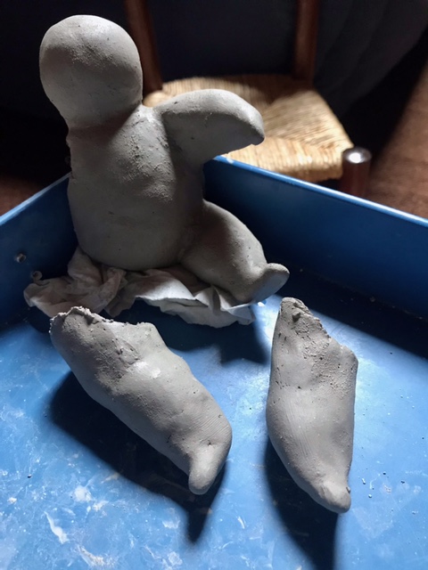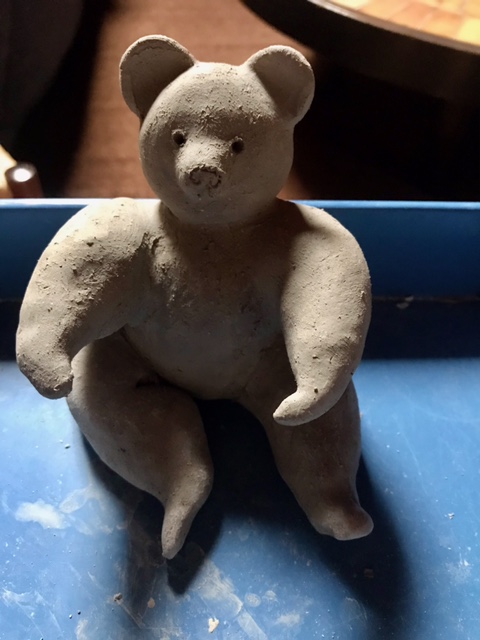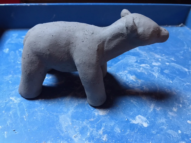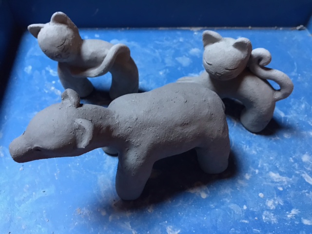 Après avoir bien malaxé la boule de terre, avec quelques « claques » pour chasser les bulles d’air, je façonne les diverses parties de mon animal en devenir, puis je les mets en place à l’aide de barbotine, boue d’argile qui sert de colle. Dernière étape, une petite inclinaison de la tête ou des pattes, pour donner vie à ma création. Et maintenant on patiente pendant le séchage.